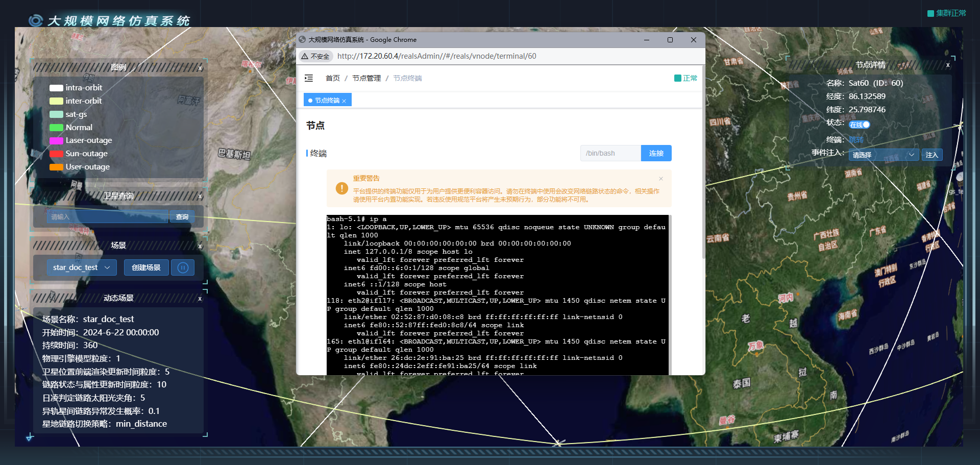 当运行网络和场景之后,可以在 可视化平台 选中一个节点,点击一个卫星之后,右上方会显示该卫星节点的详细信息。